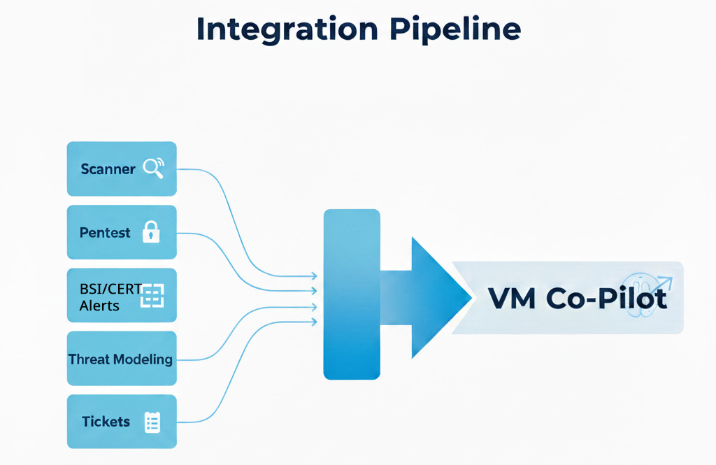 Der Vulnerability Management Co‑Pilot verbindet Ihre bestehenden Schwachstellenquellen mit einem einheitlichen Prozess: konsolidieren, bewerten, priorisieren, in Remediation überführen, verifizieren und reporten.