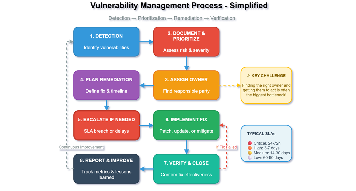 - RACI-Matrix: Klare Definition, wer für Triage, Patching und Verifikation verantwortlich ist (Security vs. IT-Betrieb).